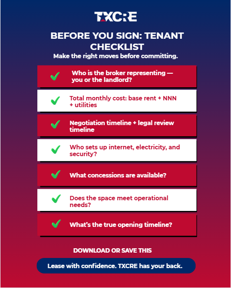 Ask about total monthly cost, NNN charges, lease term, renewal options, exclusives, setup requirements, and who’s responsible for utilities and build-out. TXCRE walks tenants through each item.